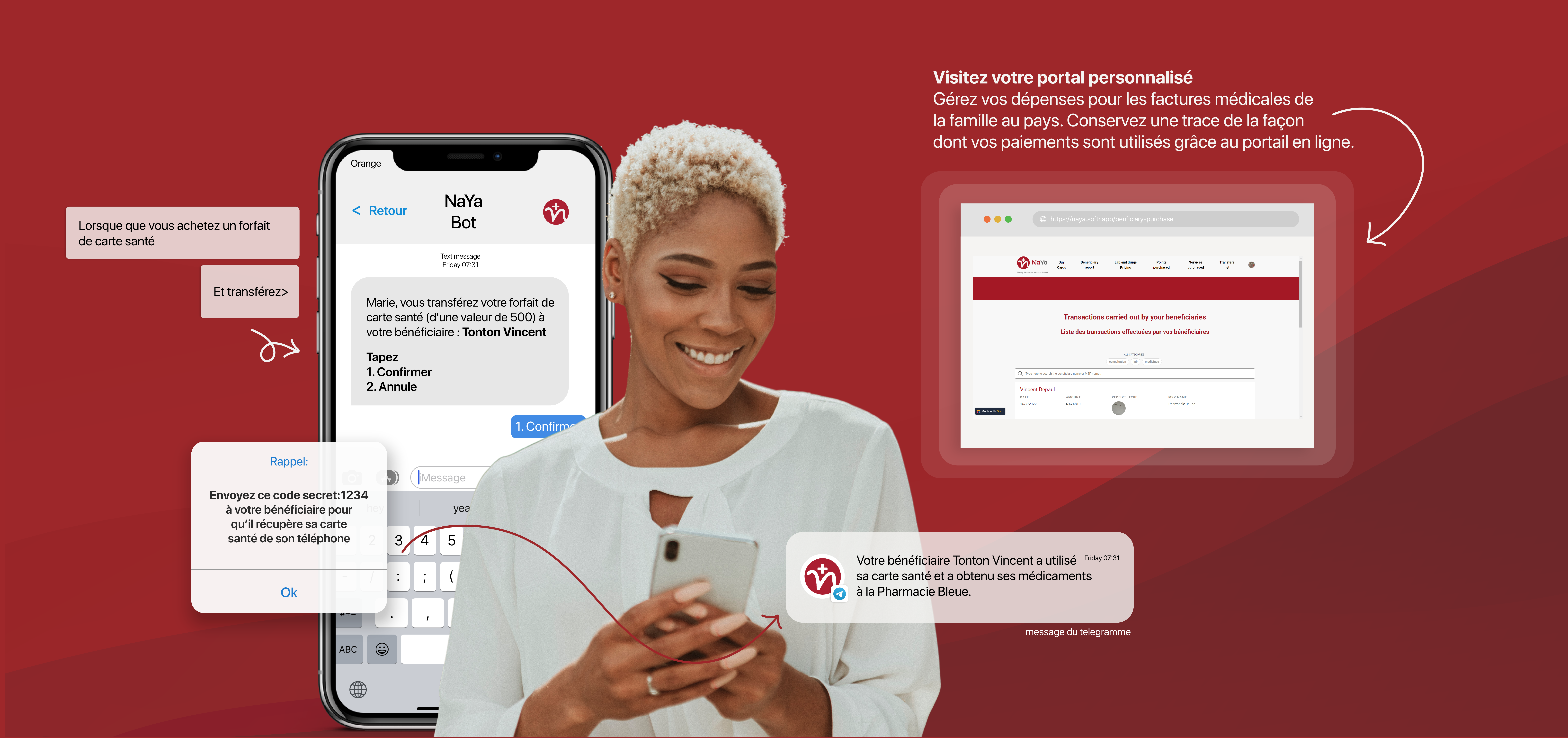 NaYa est un moyen transparent d’offrir à votre famille et proches en Afrique les soins de santé dont ils ont besoin, de n’importe où vous et n’importe quand, tout en maîtrisant vos coûts et en gardant une visibilité sur l’utilisation des fonds.