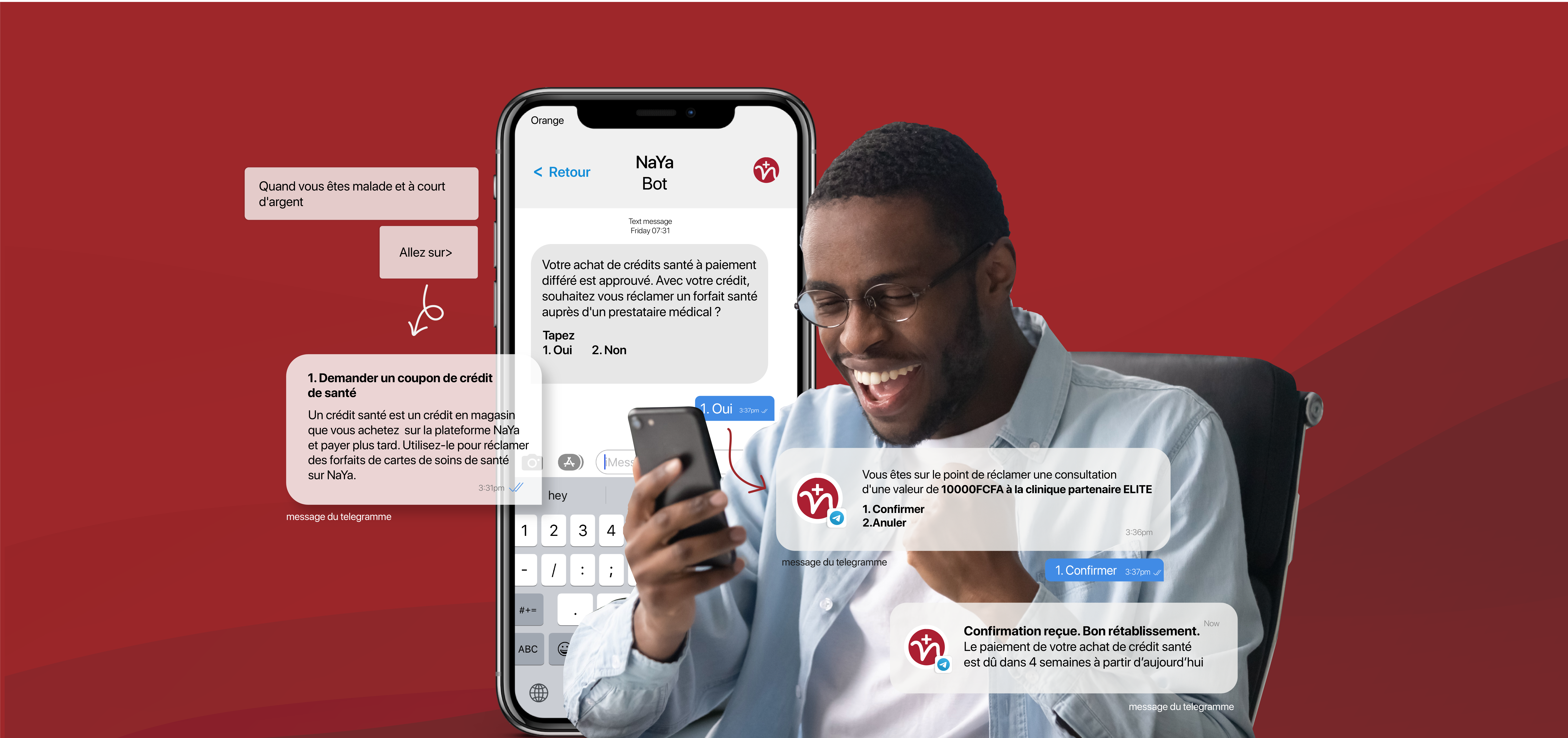 L’accès aux soins simplifié en Afrique! Sur votre téléphone, connectez-vous au chatbot de NaYa sur Telegram @nayahealthbot et configurez des soins de santé qui vous protègent, vous, vos amis et votre famille à tout moment.